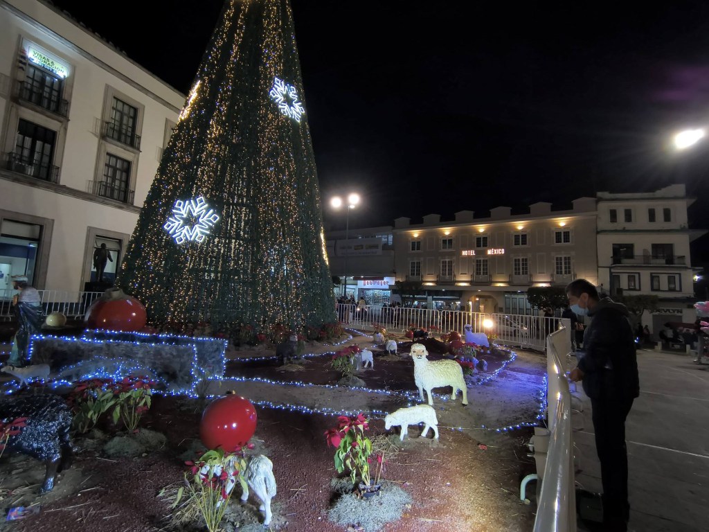 Xalapa, Ver.- Así luce el corazón de la capital en la penúltima noche del año. Entre el frío que se cuela en las calles y las luces que aún iluminan el centro, familias siguen saliendo a caminar, a mirar el nacimiento y a guardar un recuerdo en una fotografía en el parque Juárez.