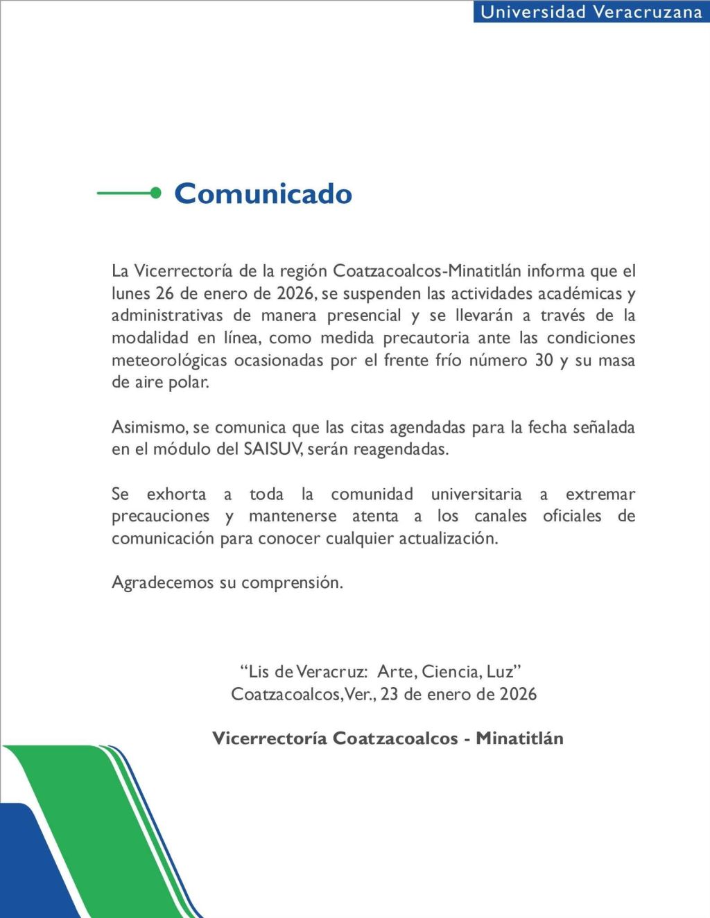 La Vicerrectoría Coatzacoalcos–Minatitlán informó que este lunes 26 de enero de 2026 se suspenden las actividades presenciales ![]()