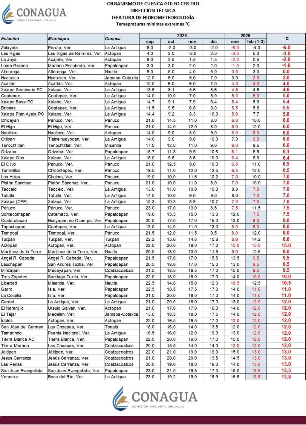 Señaló que, aunque hoy se sintió frío en todo el estado, “no en todas las zonas se registraron las temperaturas más bajas de la temporada”. Los valores más bajos se presentaron en Los Tuxtlas y las cuencas del Papaloapan, Coatzacoalcos y Tonalá, sin romper récords históricos.
